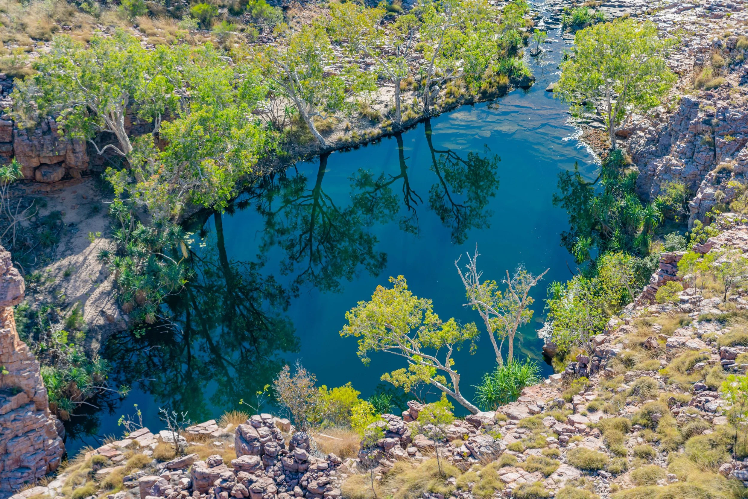 One of the Savannah Way’s hidden gems in the McArthur region. Helicopter scenic flight over remote Northern Territory, untouched wilderness, spectacular colourful rock formation, rivers, billabongs and excited, adventurous travelers swimming in an ancient, spring fed water hole, under blue sky, a lot of fun.